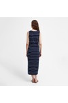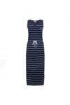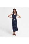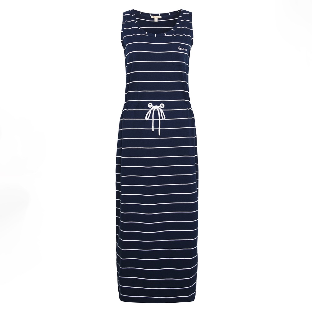 Barbour Lifestyle Overland Dress in 'navy/white' features a navy and white stripe design, small chest pocket and drawstring waistband for a flattering fit. Barbour embroidered branding is displayed to the front.