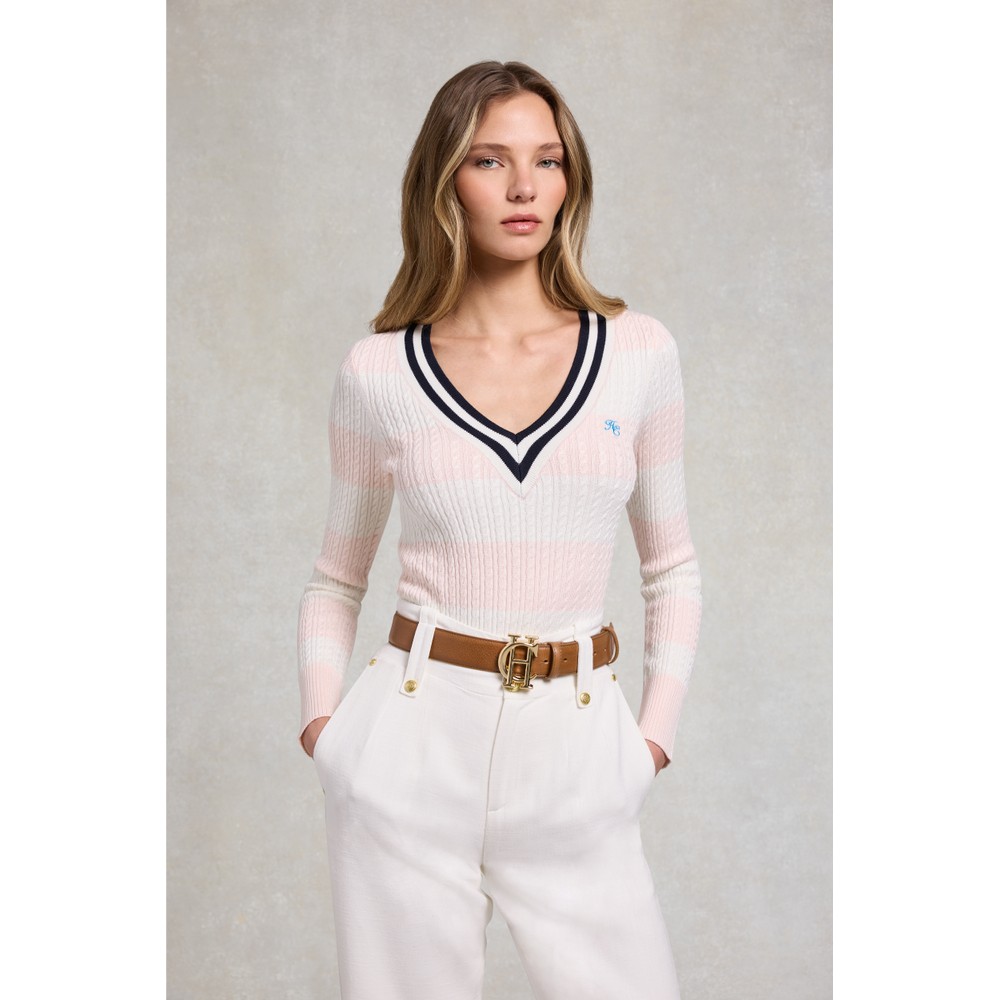 Holland Cooper Womens Badminton Knit £79.00 Colour: Blush Natural Stripe Stock alert Please alert me via email when this product is back in stock. Email address Size: Please select size Size Guide XSSML Size Guide ADD TO BAG Email me when back in stock Add to wishlist Hurry - Limited Stock! Order before 15:30 for same day dispatch Mon – Fri (excludes UK Bank Holidays) Details Info & Care Delivery Returns Holland Cooper Badminton Knit in 'blush natural stripe' is a V neck, cable knit design that features blue HC embroidery to the chest. Striped Pink V Neck Holland Cooper Jumper Cable Knit Design Blue HC Embroidery Stretchy Fit 84% Viscose 16% Polyamide 30°C Wash on Delicate Cycle Do Not Tumble Dry Cool Iron Do Not Dry Clean We aim to dispatch all orders placed before 15:30 on the same day, Monday – Friday. Orders placed after 14:30 or placed at weekends/bank holidays will be dispatched on the next working day (working days are classed as Mon-Fri). Please see the Delivery page for further information. Masdings offer 7 delivery options across the UK, Europe and Rest of the world, for more details check the delivery page. Please return the item(s) to us in their original condition complete with labels* within 14 days of receipt in a protective postage bag/box. For more information please see the Shipping & Returns page.